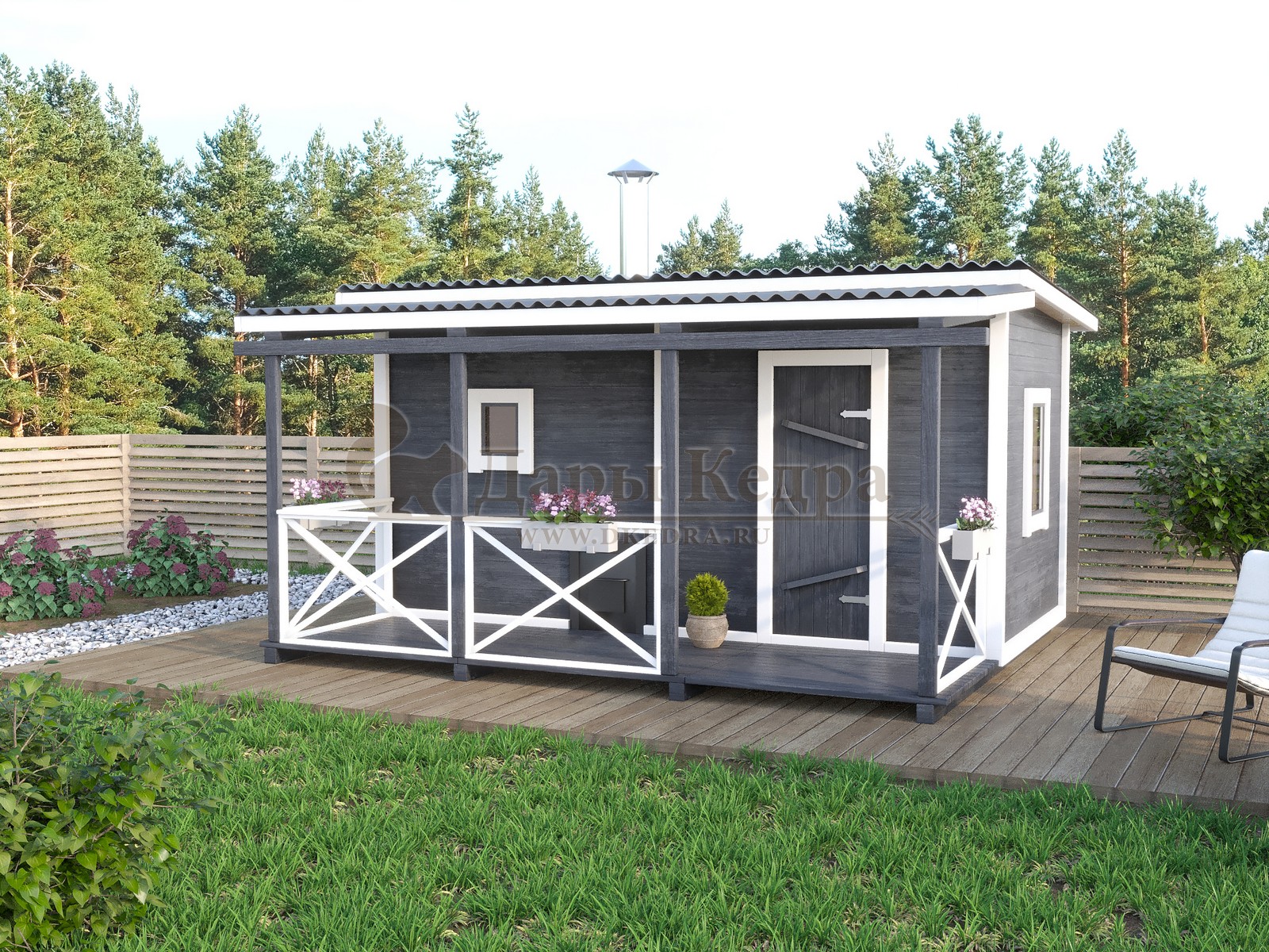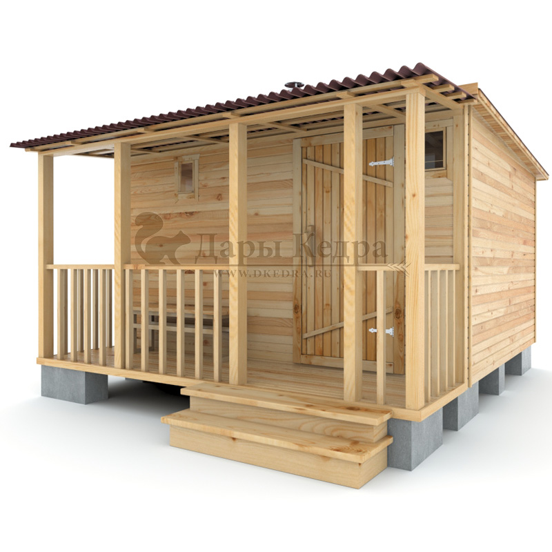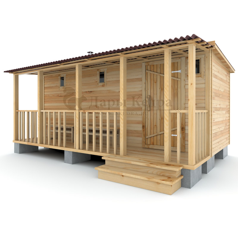 • Каркасно-щитовая баня из кедра «Мини» с верандой Это классическая прямоугольная модель бани с двумя отделениями: парилкой и раздевалкой. Для удобства пользования раздевалка оснащена лавочкой и вешалкой. Парилка оборудована двухуровневым открытым полком и печью. За счет небольшой конструкции баня нагревается в течении 30 минут. На просторной веранде можно оставить вещи или отдохнуть после парения. Каркасно-щитовую баню можно заказать как в готовом, так и в разборном варианте. В разборной модели готовые щиты из кедра быстро собираются в полноценное строение, что также позволяет исключить лишний строительный мусор. Такая баня не требует полноценный фундамент, поэтому при необходимости ее можно перенести в другое место. Обращаем Ваше внимание, что в стандартную комплектацию бани входит полок открытого типа в парной. Дополнительно можно заказать полок закрытого типа или лавку! Древесина кедра насыщена эфирными маслами и фитонцидами, которые активируются при воздействии температур. Таким образом, парение в каркаско-щитовых банях из кедра становится еще полезнее.