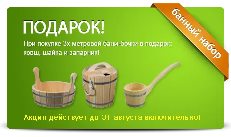 До 31 августа, при покупке 3х метровой бани-бочки в подарок: ковш, шайка и запарник!