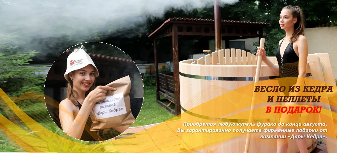 Приобретая уличную купель с подогревом фурако с 08.07.2022 до 31.08.2022, Вы гарантированно получаете фирменные подарки - весло из кедра и пеллеты!