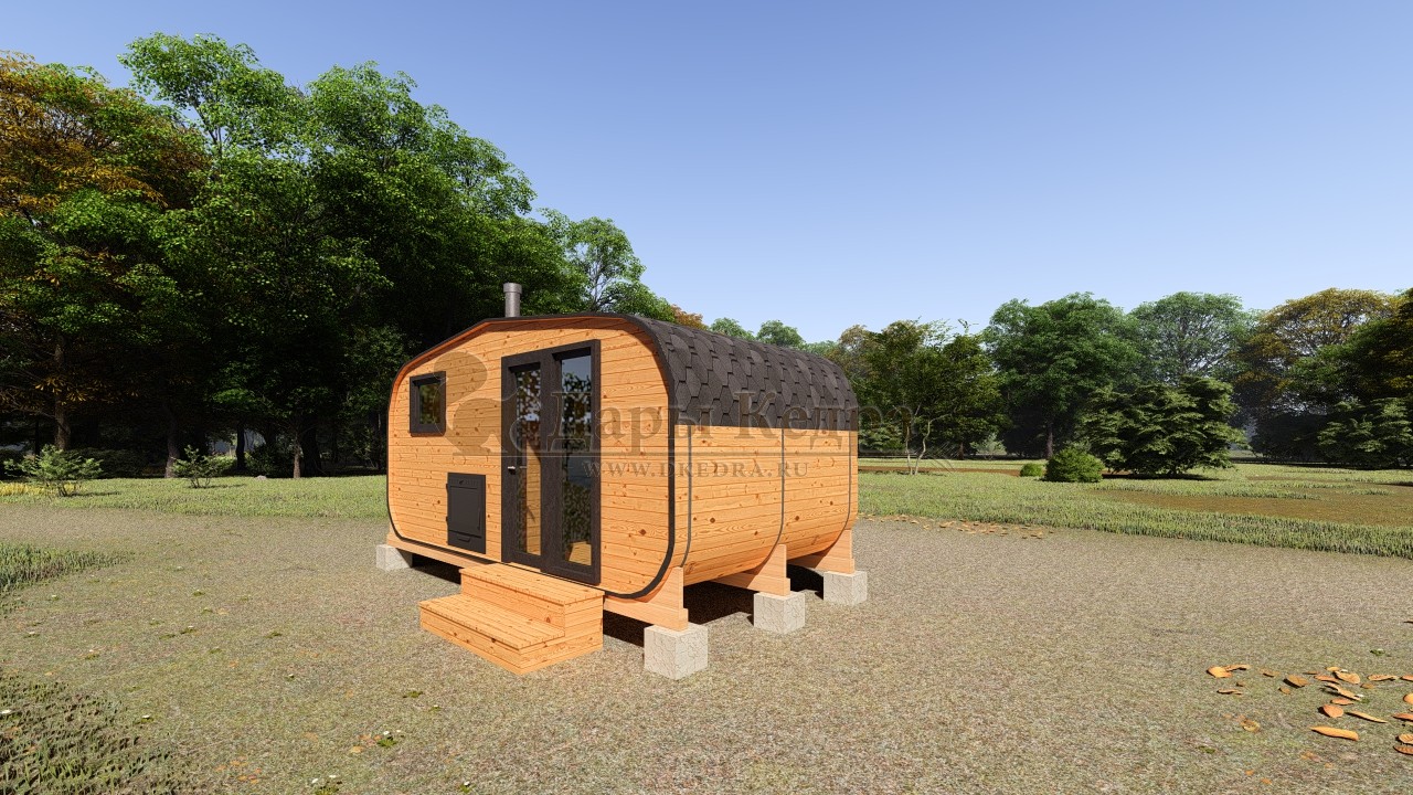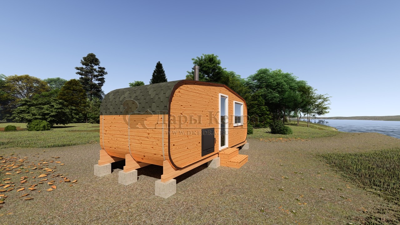 Баня-бочка «Пентагон» с панорамным окном Стильная и современная баня-бочка может быть выполнена длиною от 4 метров, с двумя отделениями (парилка и комната отдыха). Полок может быть, как с двух сторон, так и угловой, в стандарте двухуровневый. Печь в данной модели расположена сбоку с топкой внутрь парилки, либо наружу или в соседнее помещение. Печь можно укомплектовать баком для воды, а саму баню сделать длиною до 6 метров, комфортно разместив в ней дополнительно помывочную. Панорамное окно на входе добавит света и уюта в раздевалке. Установив баню в живописном месте, во время процедур можно наслаждаться видами из окна. В эту модель включено одно закаленное квадратное стекло в комнате отдыха. Обращаем Ваше внимание, по умолчанию в данной модели отсутствует бак для воды, вместо него идёт утеплённая термо-труба, которую можно заменить на бак по желанию.