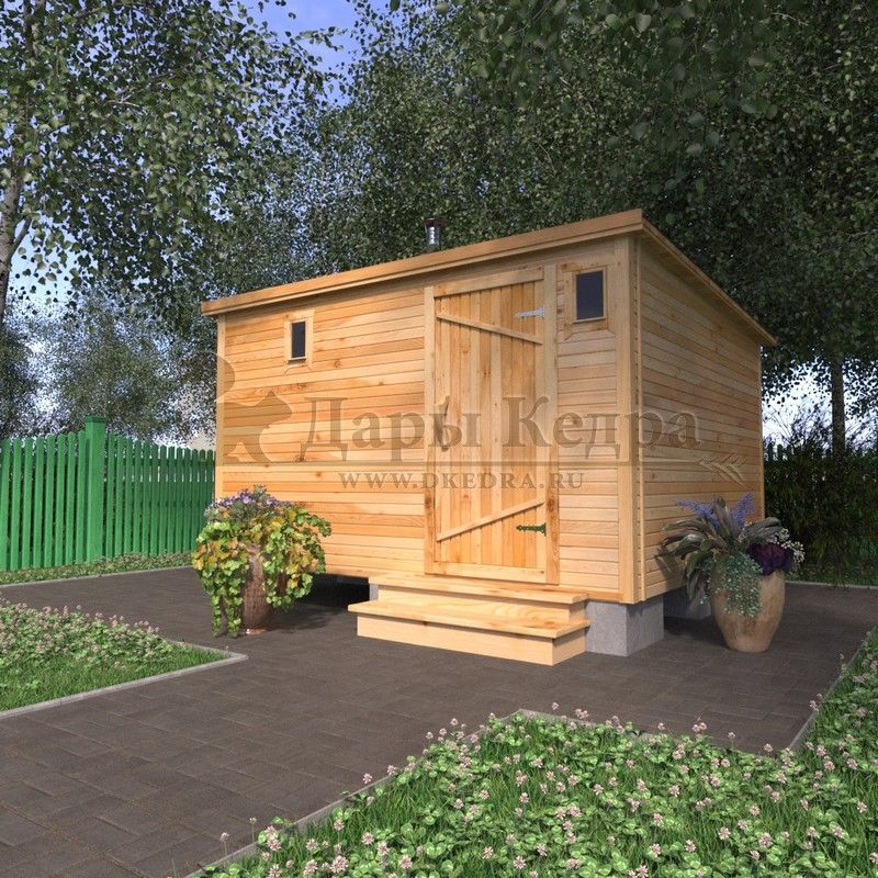 Каркасно-щитовая баня из кедра «Сканди» с верандой Это классическая прямоугольная модель бани с двумя отделениями: предбанником и парилкой, а так же удобной терассой. Предбанник оснащен лавочкой и вешалкой. Парилка оборудована двухуровневым открытым полком и печью. Время растопки такой бани не превышает 30 минут. Каркасно-щитовую баню можно заказать как в готовом, так и в разборном варианте. В разборной модели готовые щиты из кедра быстро собираются в полноценное строение, что также позволяет исключить лишний строительный мусор. Такая баня не требует полноценный фундамент, поэтому при необходимости ее можно перенести в другое место. Древесина кедра насыщена эфирными маслами и фитонцидами, которые активируются при воздействии температур. Таким образом, парение в каркаско-щитовых банях из кедра становится еще полезнее.