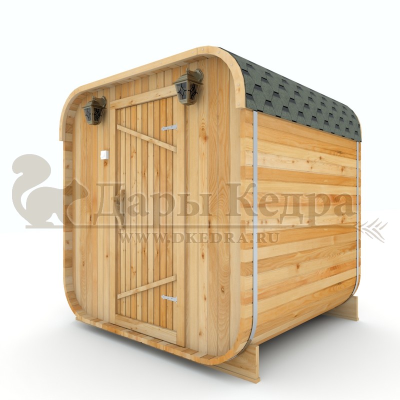 Баня-бочка квадро из кедра 3 метра Это квадратное изделие с закругленными углами. За счет такой конструкции во время топки воздух циркулирует по кругу, поэтому баня-бочка нагревается не более 30 минут. Баня включает в себя раздевалку и парилку. Лавочки из кедра установлены по всей длине бани-бочки с обеих сторон. Печь расположена в парилке около дальней стены. Для удобства пользования в раздевалке находится вешалка и полочка из кедра. По вашему желанию баню-бочку квадро можно укомплектовать козырьком, верандой и печью с внешней загрузкой, благодаря которой весь мусор после топки остается на улице. Баня-бочка квадро не требует полноценный фундамент, поэтому при необходимости ее можно перенести в другое место. Обращаем Ваше внимание, что в стандартную комплектацию бани входят лавки в парной с обеих сторон. Дополнительно можно заказать полок открытого или закрытого типа! Кедр обладает ароматическими свойствами. Он не деформируется и влагоустойчив, при правильном уходе за деревом на нем не развиваются грибки и плесень. Обращаем Ваше внимание, что данную модель бани-бочки можно изготовить с ровным полом. Эта дополнительная опция и оплачивается отдельно!