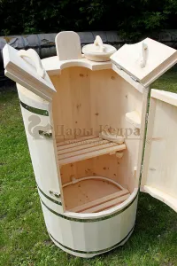 Готовый комплект - это полностью укомплектованный набор с фитобочкой для процедур парения. Круглая модель наиболее компактна и мобильна. Толщина стенок составляет 40-45 мм, что позволяет увеличить срок службы изделия. Бочка оборудована откидными створками, дверцей и отверстием для головы. Верхний скос делает положение головы более комфортным и улучшает обзор. Во время парения человек сидит внутри кедровой бочки, а голова находится снаружи. Благодаря этому исключается возможность перегрева. Подлокотники из кедра, встроенные ручки на створках и двери делают эксплуатацию более удобной.