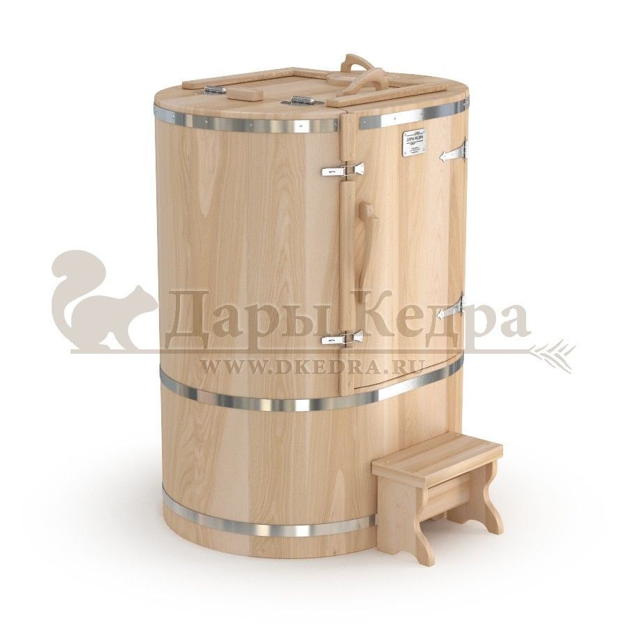 Кедровая бочка (фитобочка) овальная со скосом «Классическая» Овальная фитобочка из кедра - это мини парная, которую можно использовать не только в спа-салонах, но и дома. Овальная модель более просторна и удобна в использовании. Толщина стенок составляет 25 мм. Верхний скос делает положение головы более комфортным и улучшает обзор. Она оборудована откидными створками, дверцей и отверстием для головы. Во время парения человек сидит внутри кедровой бочки, а голова находится снаружи. Благодаря этому исключается возможность перегрева. Подлокотники из кедра, встроенные ручки на створках и двери делают эксплуатацию более удобной. Парение в фитобочке благотворно влияет на организм в целом: повышается иммунитет, выводятся шлаки и токсины, улучшается работа органов тела и состояние кожи.