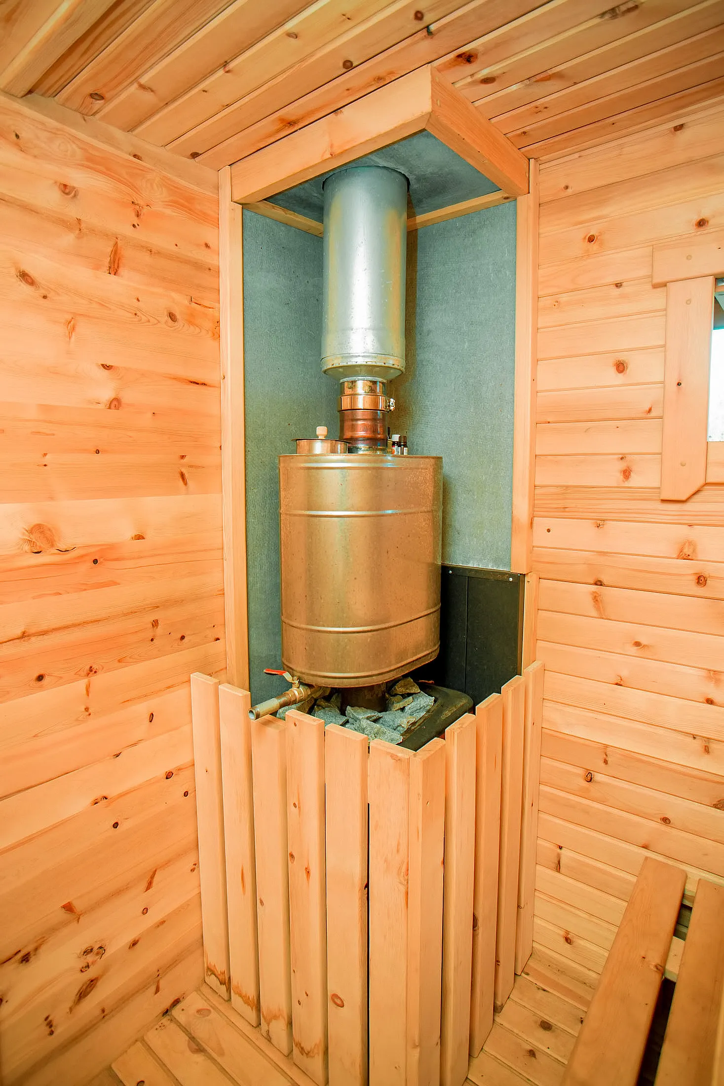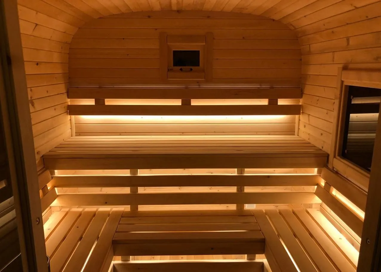 Стильная и современная баня-бочка может быть выполнена длиною от 3 метров, что-бы парильное отделение было не менее 2,5 метров для безопасного расстояния человека от печи. Полок одноуровневый, что позволяет в полной мере наслаждаться видом из панорамного окна. Печь идёт с внутренней топкой по центру, её можно установить сбоку с топкой внутри, снаружи, либо вынести топку в соседнее отделение. Печь можно укомплектовать баком для воды, а саму баню сделать длиною до 6 метров, комфортно разместив в ней дополнительно помывочную и комнату отдыха.