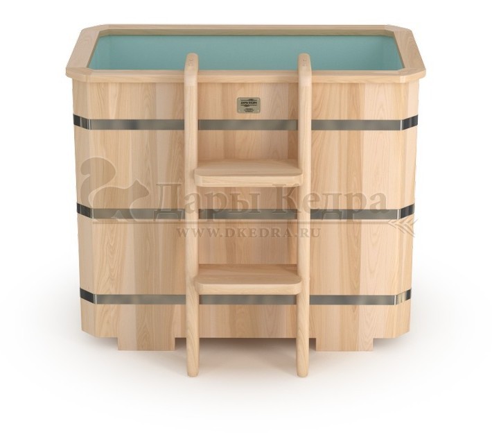 Бондарная прямоугольная купель из кедра с пластиковой вставкой Особенность этой модели заключается в сборке купели по технологии лунный-паз. Паз (углубление) одной доски прочно соединяется с выемкой следующей. Такая сборка осуществляется без клея и гвоздей. Готовая конструкция прочно фиксируется нержавеющими обручами. Пластиковая вставка придает изделию красивый внешний вид, увеличивает срок службы и облегчает уход за купелью. Для удобства пользования купель оснащена лавочками, приставной и внутренней лестницей из кедра. Подходит для комнатного и уличного использования. Купели с пластиковой вставкой рекомендуется заказывать для непрерывного использования в банных комплексах или оздоровительных центрах. Внутренняя чаша облегчает уход за изделием и увеличивает срок службы купели.