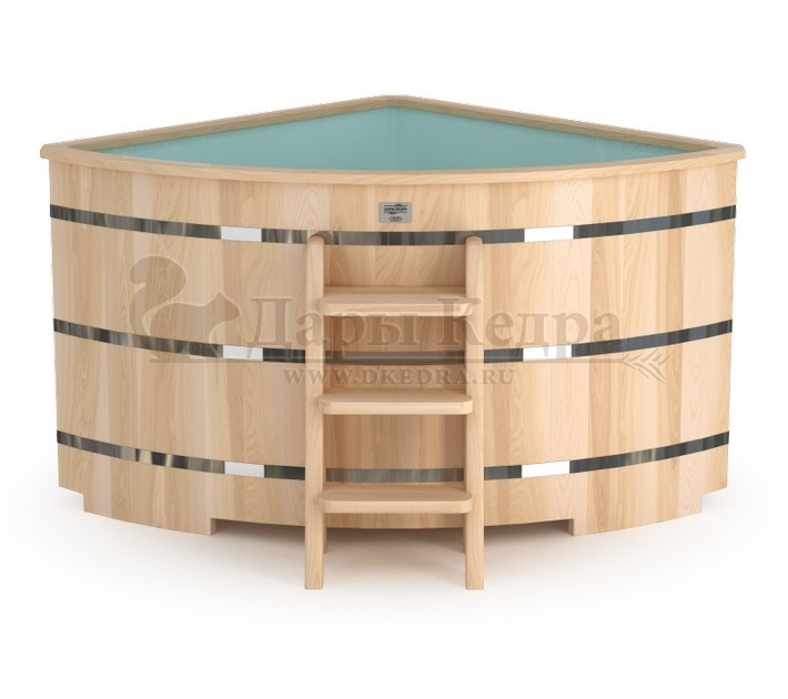 Бондарная угловая купель из кедра с пластиковой вставкой Особенность этой модели заключается в сборке купели по технологии лунный-паз. Паз (углубление) одной доски прочно соединяется с выемкой следующей. Такая сборка осуществляется без клея и гвоздей. Готовая конструкция прочно фиксируется нержавеющими обручами. Пластиковая вставка придает изделию красивый внешний вид, увеличивает срок службы и облегчает уход за купелью. Для удобства пользования купель оснащена лавочками, приставной и внутренней лестницей из кедра. Подходит для комнатного и уличного использования. Купели с пластиковой вставкой рекомендуется заказывать для непрерывного использования в банных комплексах или оздоровительных центрах. Внутренняя чаша облегчает уход за изделием и увеличивает срок службы купели.