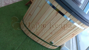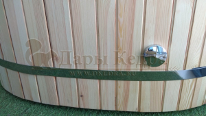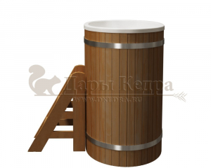 Это купель с внутренней овальной чашей, которая изготовлена из современного прочного и термоустойчивого материала (композита). Форма чаши обеспечивает комфортную посадку внутри изделия. Для удобного использования купель оснащена приставной лестницей. Обручи из нержавеющей стали декорируют купель с композитом и равномерно распределяют нагрузку во время процедур.