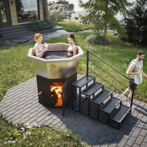 Банный чан с ветрозащитой изготовлен из пищевой стали. Представляет собой большую ёмкость в виде чаши, при нагревании которой можно париться на свежем воздухе. Банный чан установлен на металлическую закрытую подставку, которая служит защитой от ветра и печью одновременно. В комплект такой модели входит дымоход 2 метра. Чан оборудован кедровым бортом, скамейками, подспинниками, трапом для ног и приставной лестницей.