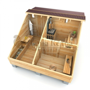 Это классическая прямоугольная модель бани с тремя отделениями: предбанником, моечной и парилкой. Для удобства пользования предбанник оснащен лавочкой и вешалкой. В моечной находится лавка и полочка из кедра. Парилка оборудована двухуровневым открытым полком и печью. За счет небольших размеров баня нагревается не более 30 минут. На просторной веранде можно оставить вещи или отдохнуть после парения. Каркасно-щитовую баню можно заказать как в готовом, так и в разборном варианте. В разборной модели готовые щиты из кедра быстро собираются в полноценное строение, что также позволяет исключить лишний строительный мусор. Такая баня не требует полноценный фундамент, поэтому при необходимости ее можно перенести в другое место.
