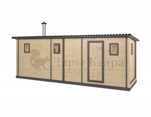 Это классическая прямоугольная модель бани с тремя отделениями: предбанником, моечной и парилкой. Для удобства пользования предбанник оснащен лавочкой и вешалкой. В моечной находится лавка и полочка из кедра. Парилка оборудована двухуровневым открытым полком и печью. Время растопки такой бани не превышает 30 минут. Каркасно-щитовую баню можно заказать как в готовом, так и в разборном варианте. В разборной модели готовые щиты из кедра быстро собираются в полноценное строение, что также позволяет исключить лишний строительный мусор. Такая баня не требует полноценный фундамент, поэтому при необходимости ее можно перенести в другое место.