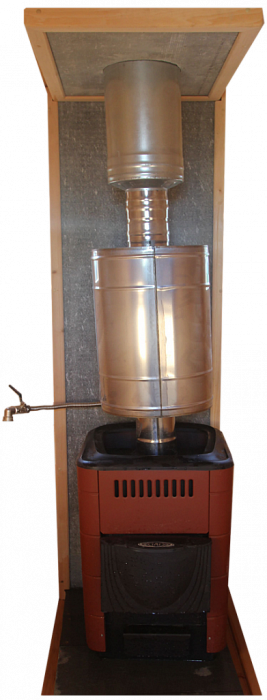 Также для комфортной эксплуатации парной из кедра предусмотрена в комплектации дровяная печь Термофор с трубой и дымоходом в сборе. Печь соединена с баком для горячей воды. Чтобы начать пользоваться баком с водой, необходимо дополнить его краном ¾. Труба устанавливается согласно инструкции от производителя печи, ниже показана последовательность установки трубы.