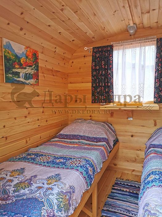 Оригинальное строение в виде бани-бочки, казалось бы, вообще не вариант для обустройства под дом. Но покажем наглядно, какими элементами можно дополнить раздевалку, чтобы баня в виде вагончика функционалом ничем не отличалась от летнего домика. Откидные столики, полочки, коврики, лежанки, зеркала и многое другое создадут уют, стены из кедра добавят тепла и оригинального древесного аромата. Кроме того, если парная выполнена в форме буханки, тут открываются необъятные просторы для дизайна и зонирования комнат для отдыха, спа-процедур. Ведь сама по себе такая форма бани предполагает увеличение пространства за счет ровного пола и увеличенной высоты потолков до 2,3 метра. На примерах уже завершенных проектов можно почерпнуть для себя идеи, добавить что-то свое и получится вполне оригинальный, комфортный дом для проживания летом. Если конструкцию утеплить на стадии строительства, то в таком домике можно проводить даже зимние вечера. Также стоит отметить, что такой дом-баня из кедра отличается не только функционалом, но и своей пользой за счет лечебной древесины кедра.