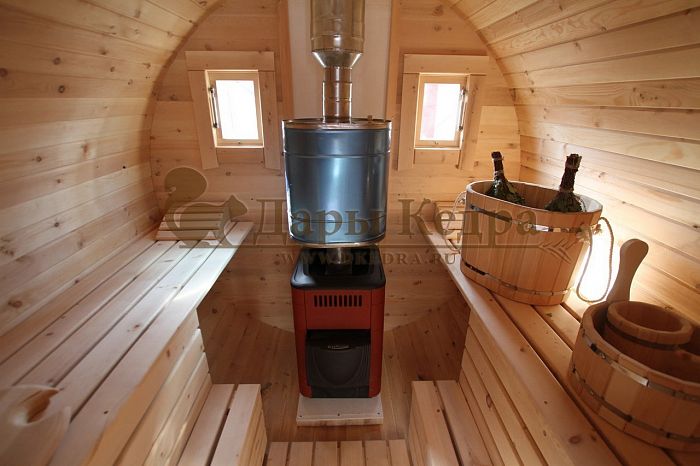Третьим преимуществом, очень значимым при выборе мобильной парилки в виде бочки, является высокая скорость прогрева (за счет округлости тепло распространяется быстрее), в конструкции нет углов, поэтому внутреннее пространство можно использовать максимально. Можно протопить парную, используя всего 7- 8 поленьев.