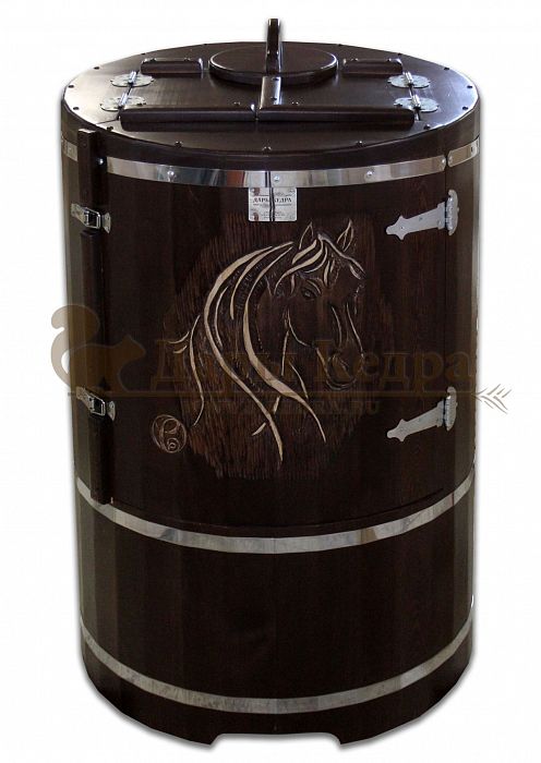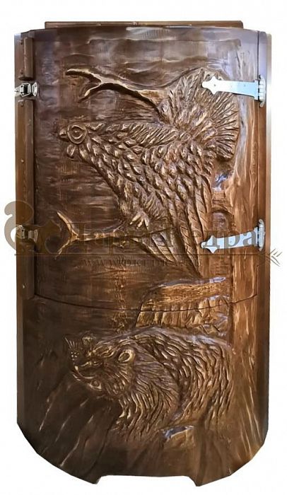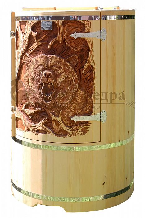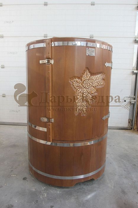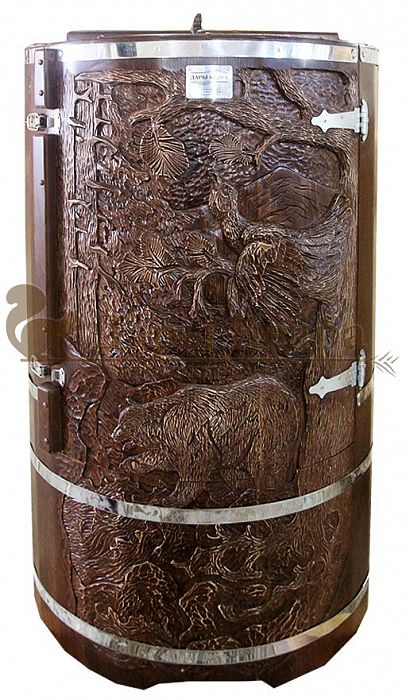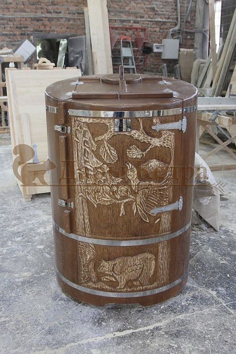 И, конечно, стоит отметить мастеров компании, осуществляющих профессиональную резьбу на древесине фитобочки или купели. Изделие с художественным оформлением - это выбор ценителей красоты, индивидуальности, эко-стиля. Бочка с резьбой станет объектом всеобщего внимания. Можно выполнить тонирование рисунка или окрашивание всей бочки в круговую и выделение рисунка сделать отдельно с помощью осветления. Таким образом, более светлый контур резьбы будет смотреться очень ярко на темной фитобочке. Все работы по художественному оформлению проводятся мастерами вручную, никаких станков!