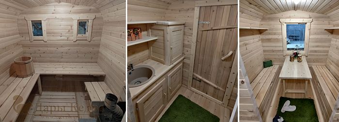 Компания «Дары Кедра» занимается производством мобильных бань и кемпингов уже более шести лет. За это время были освоены новые технологические процессы, позволяющие построить теплый кемпинг, в котором будут проведены все коммуникации, встроена техника, шкафы и даже выделено отдельное помещение для сауны. Казалось бы, зачем целую комнату задействовать под сауну? Но представьте ситуацию, когда вы приходите с прогулки зимой, насколько будет приятно и полезно погреться в кедровой парилке. К тому же сауна в доме не позволит быстро ему остыть, сохраняя тепло внутри, словно термос. После парной можно комфортно разместиться в комнате отдыха за чашкой чая или прилечь отдохнуть, для этого уже есть продуманные скамьи-лежаки с отсеком для хранения пледов, одеял и других спальных принадлежностей.