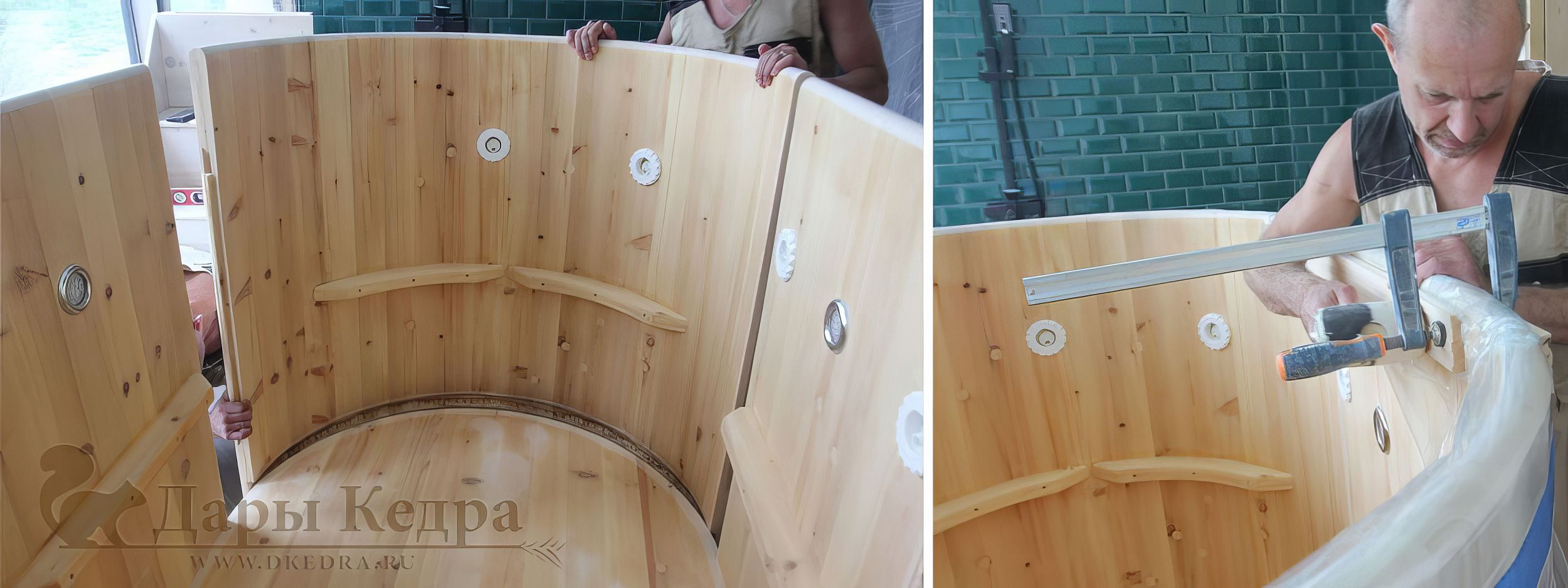 Купели из кедра могут быть разных форм и размеров: круглые, овальные, угловые, прямоугольные и квадратные. Каждая форма и размер предполагает свою схему сборки. Изделие доставляется в собранном виде, стянутая обручами. Перед началом сборки необходимо разобрать купель, занести по частям в помещение, где будет в дальнейшем она установлена, а далее осуществить сборку по месту.